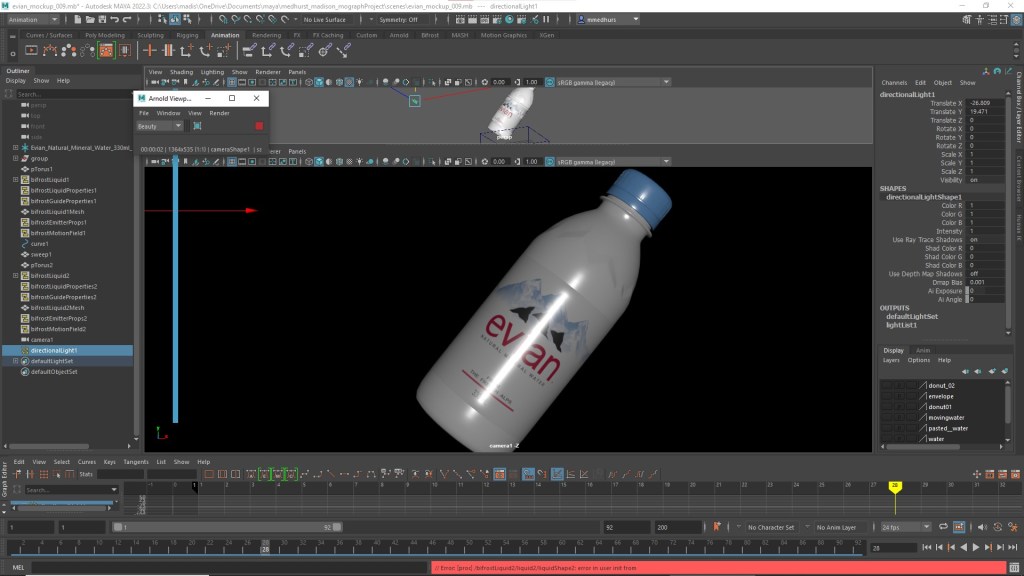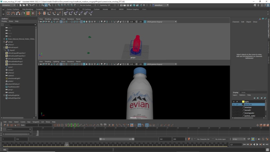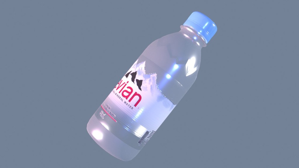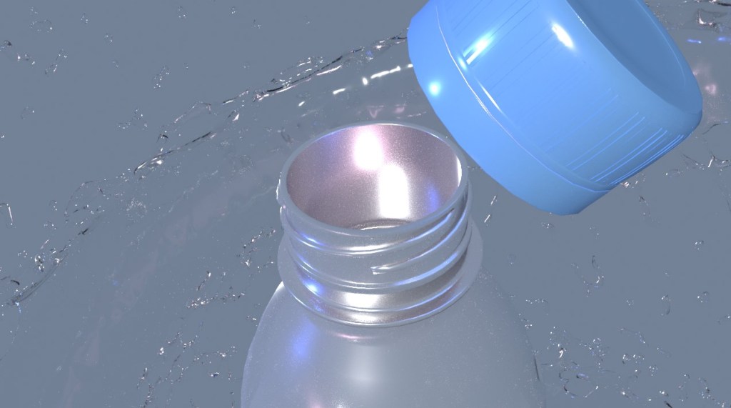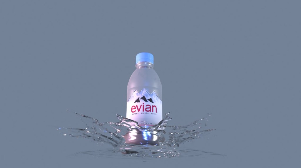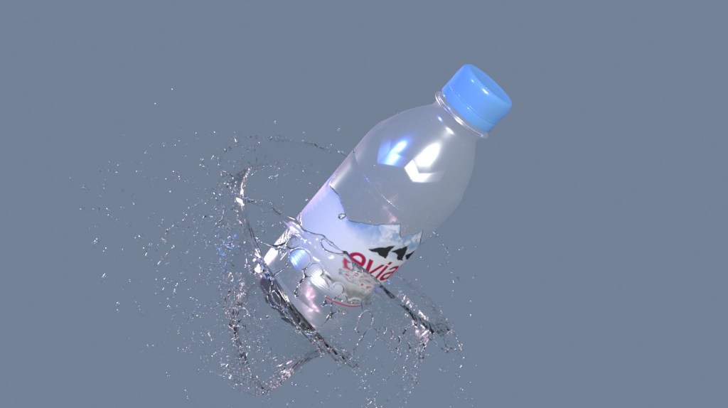 I began by blocking in the bottle and water motions inside of Maya, however I decided to use a different water asse to emphasize more detail and give the illusion of water splashing.