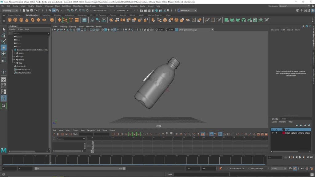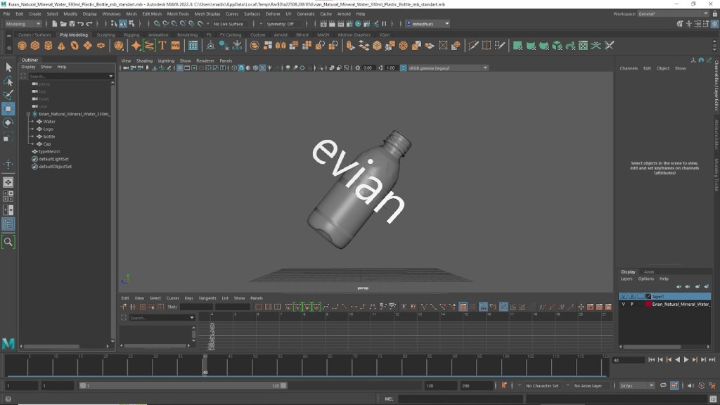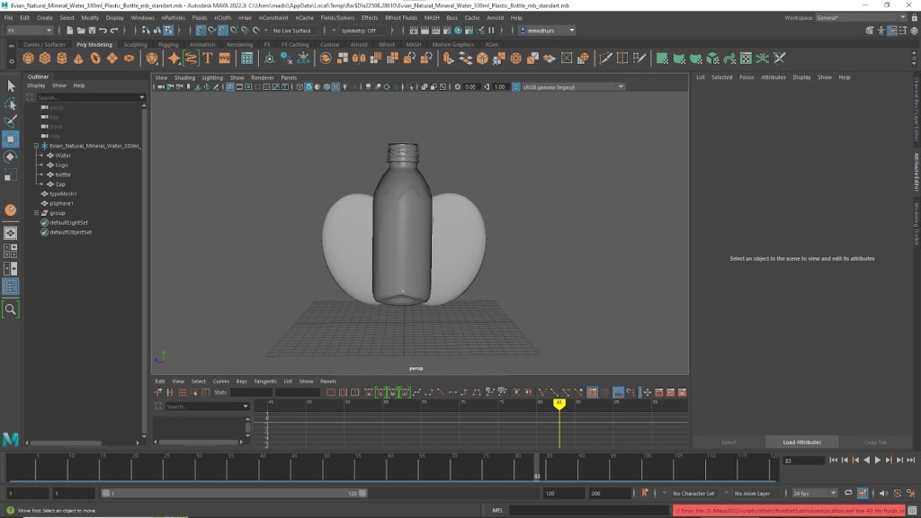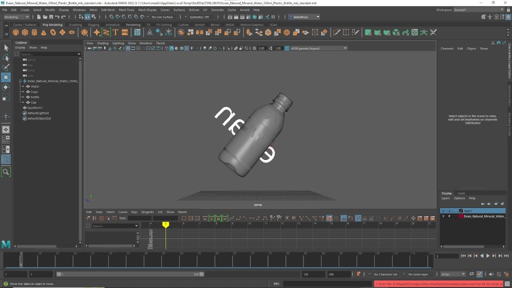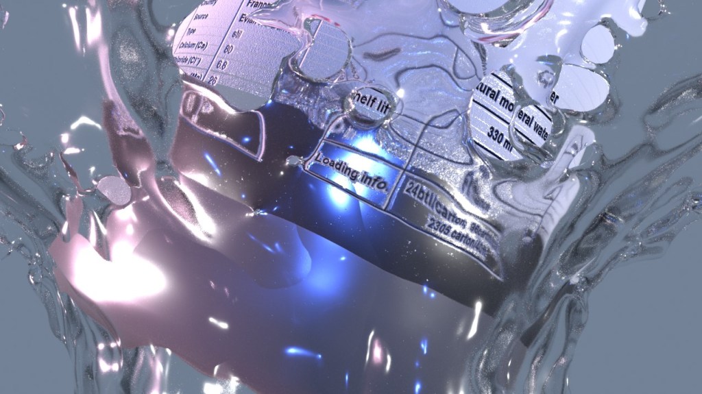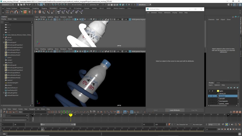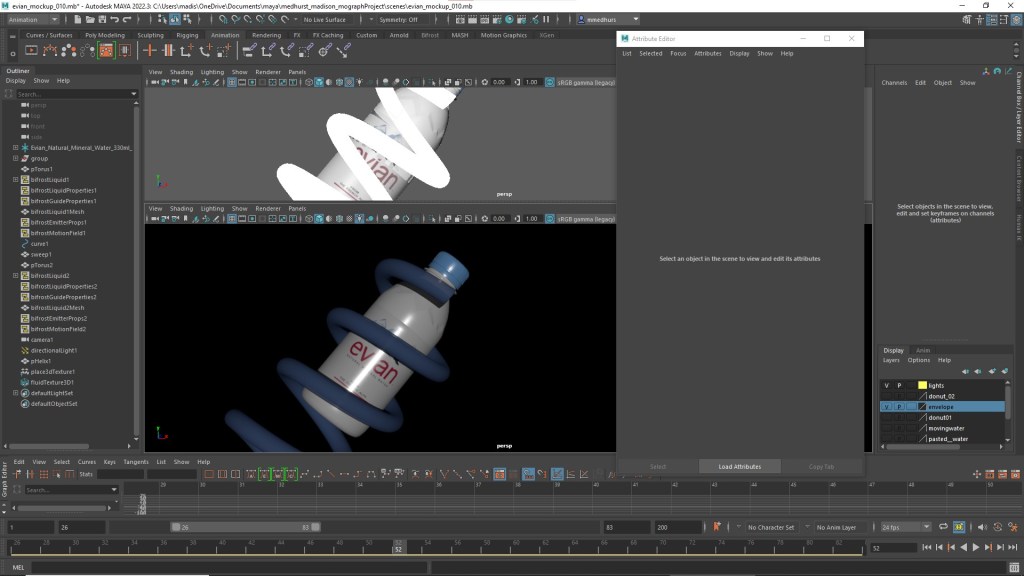 I began by blocking in the bottle and water motions inside of Maya, however I decided to use a different water asse to emphasize more detail and give the illusion of water splashing.