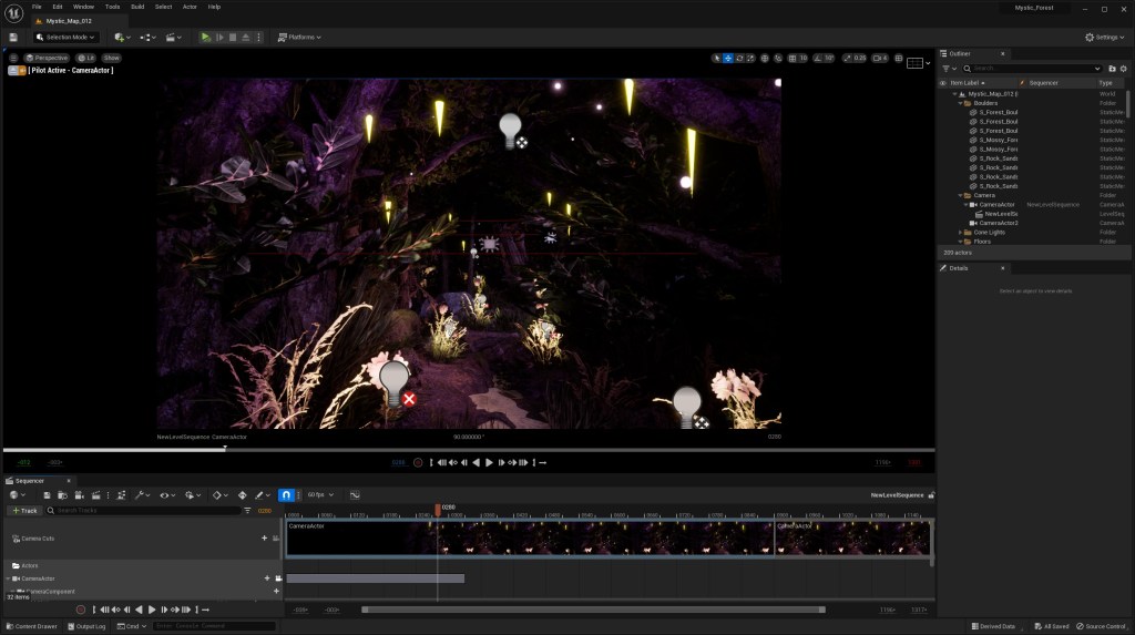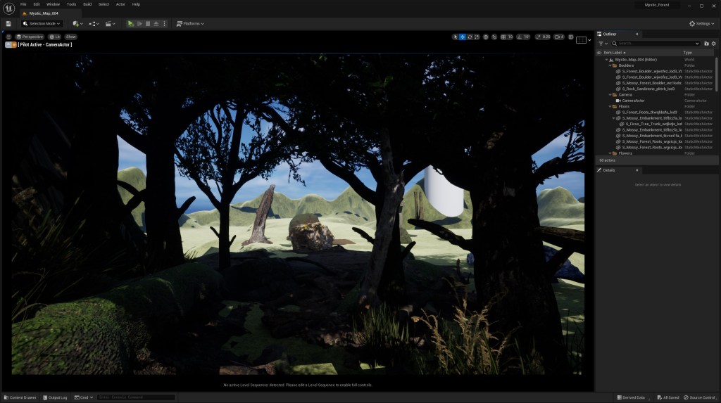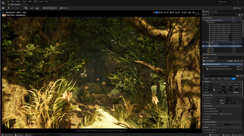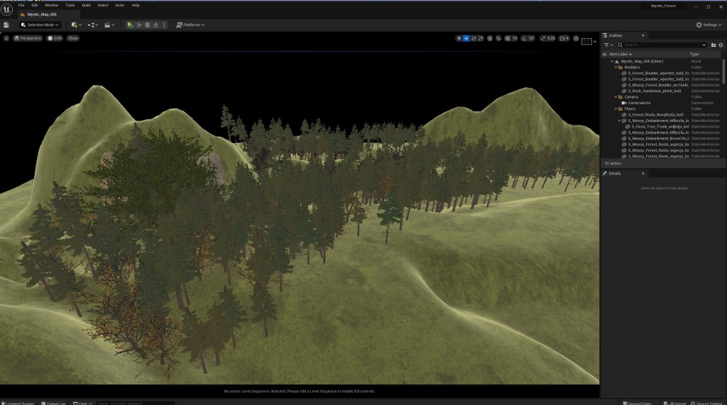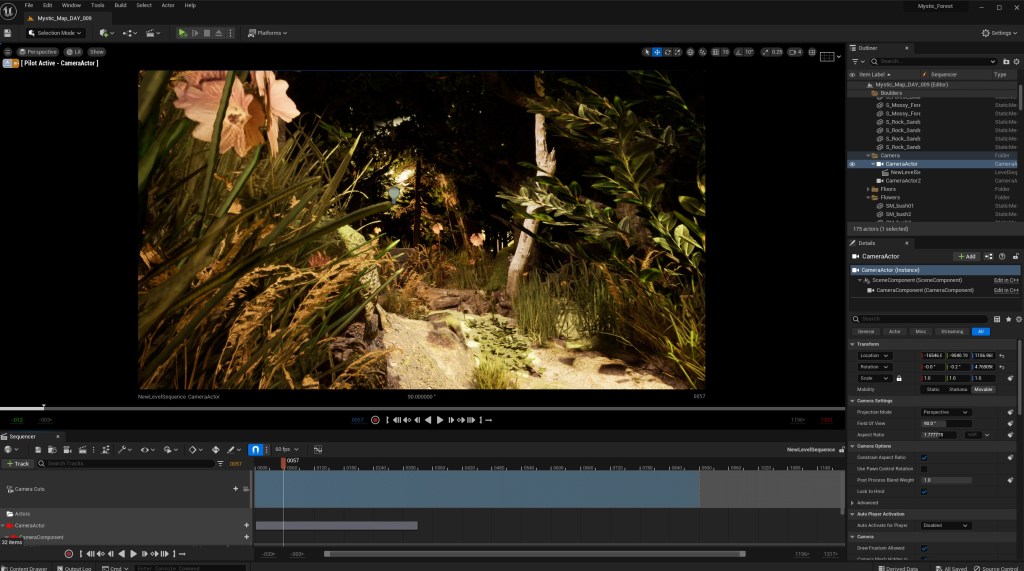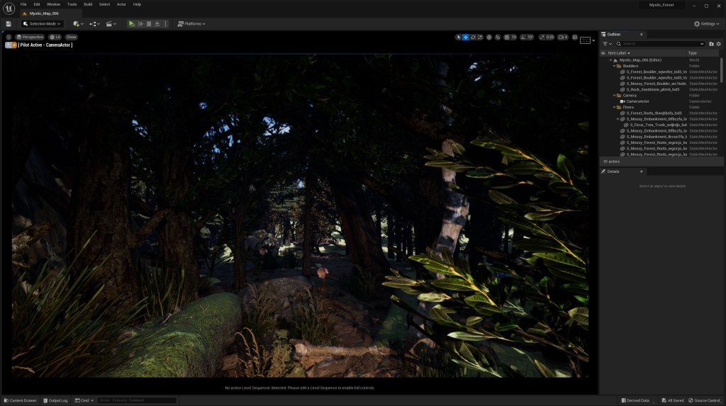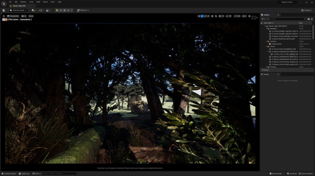 In Unreal engine, it took time to find a layout I felt would feel “full”. I began by adding assets from the Epic Games store and laying them out in a way I found appealing. The first camera places was made to peer inside through the woods.