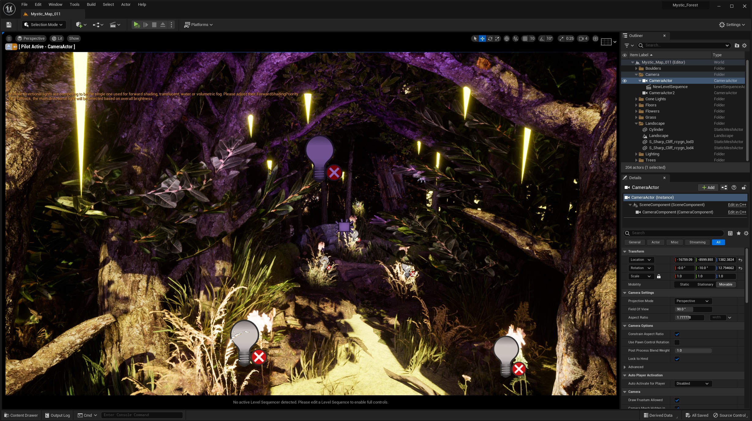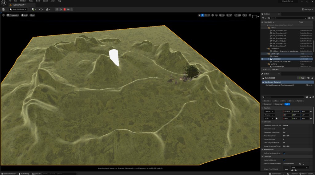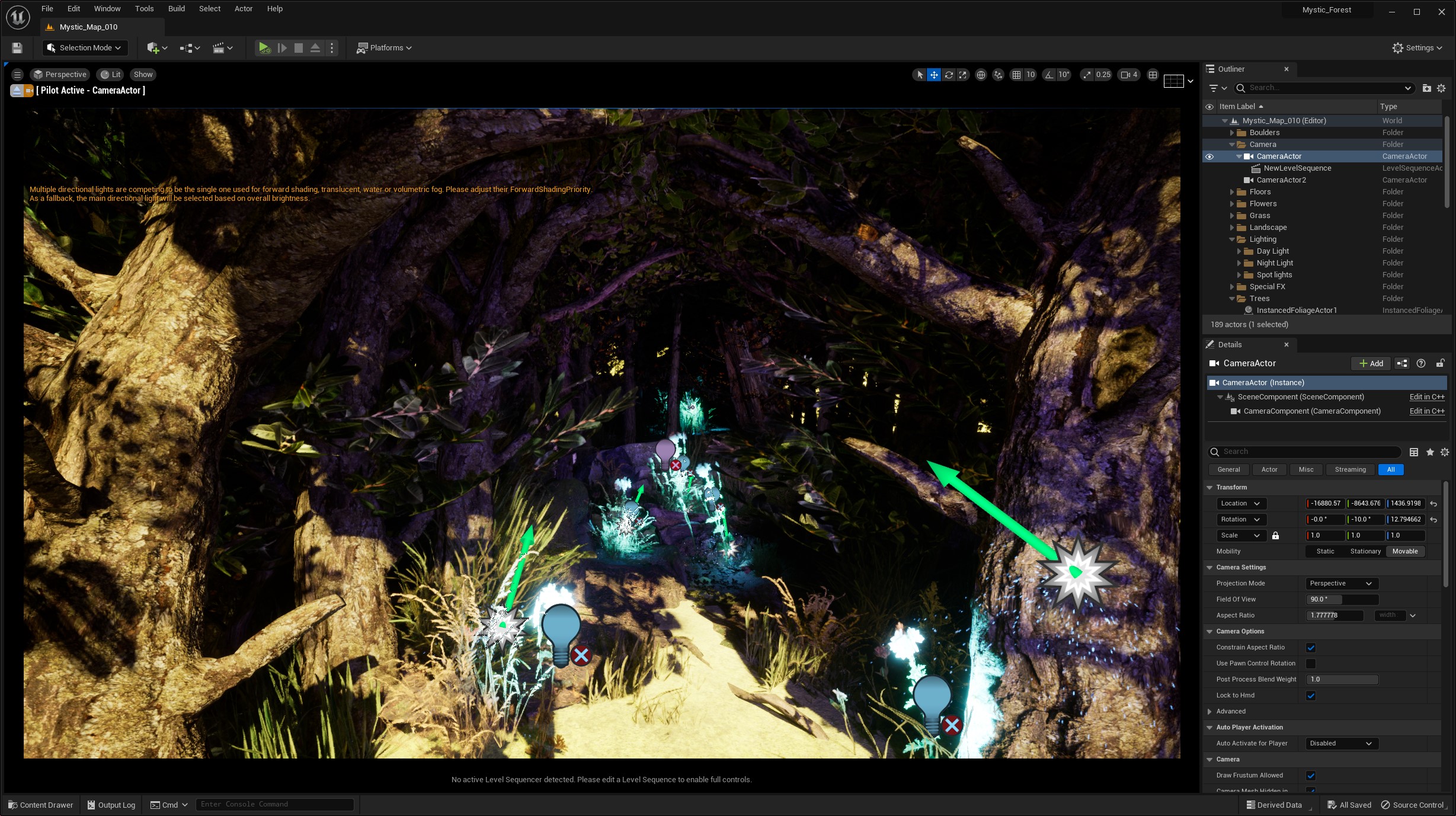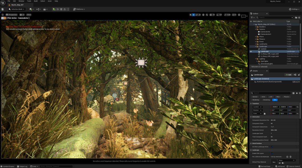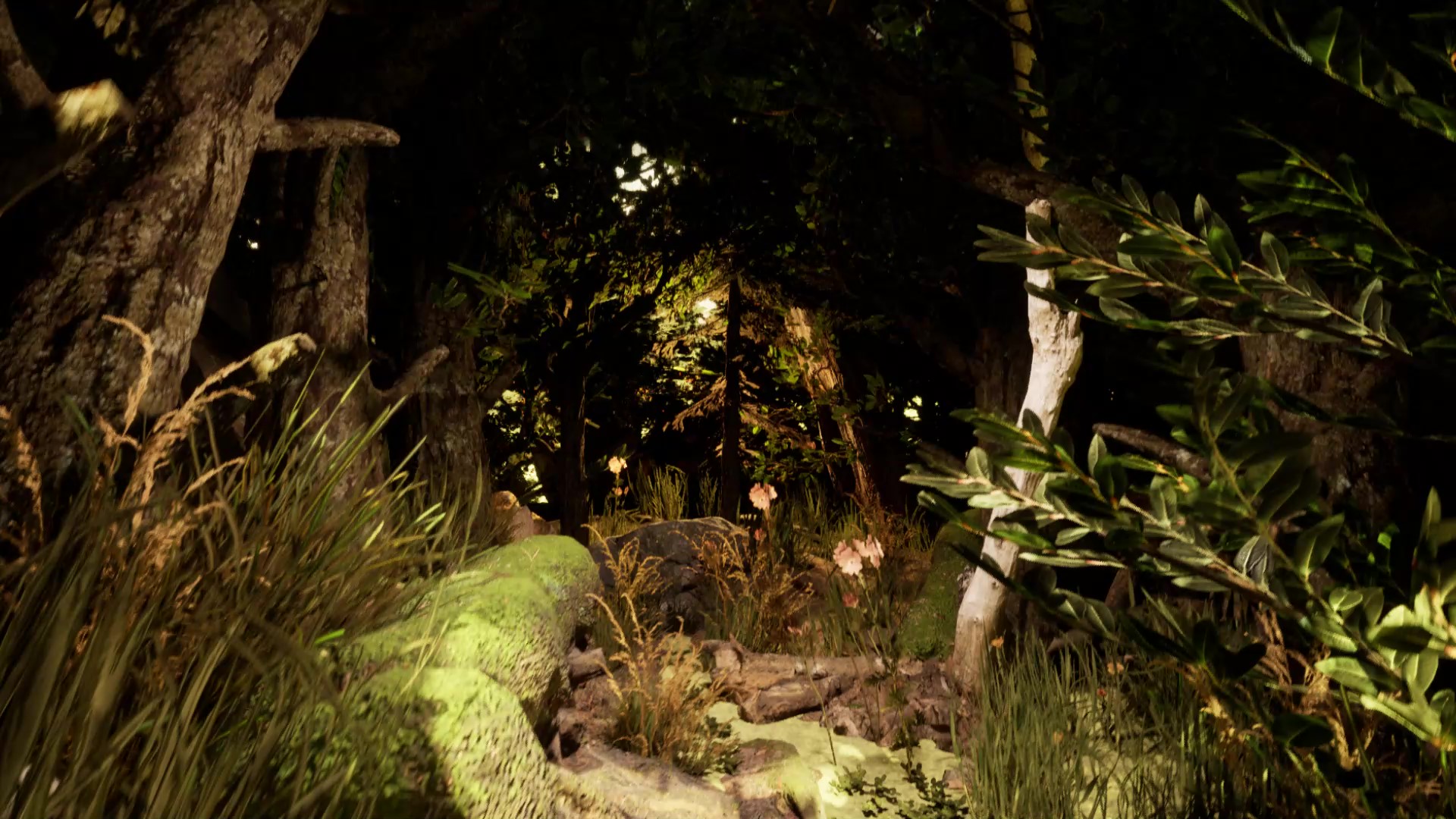 In Unreal engine, it took time to find a layout I felt would feel “full”. I began by adding assets from the Epic Games store and laying them out in a way I found appealing. The first camera places was made to peer inside through the woods.