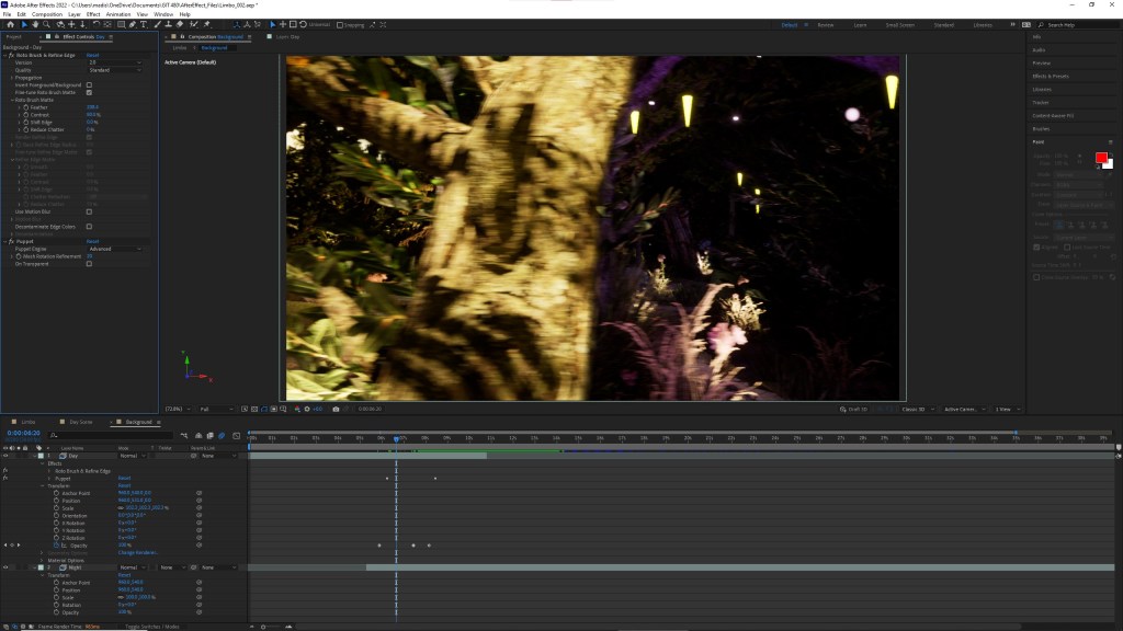 After rendering two seperate cameras for both the day and night portions of the scene, I incorporated them into after effects. To blend the two scenes, I used a mask to blend both scenes together to form a transition between the two worlds.