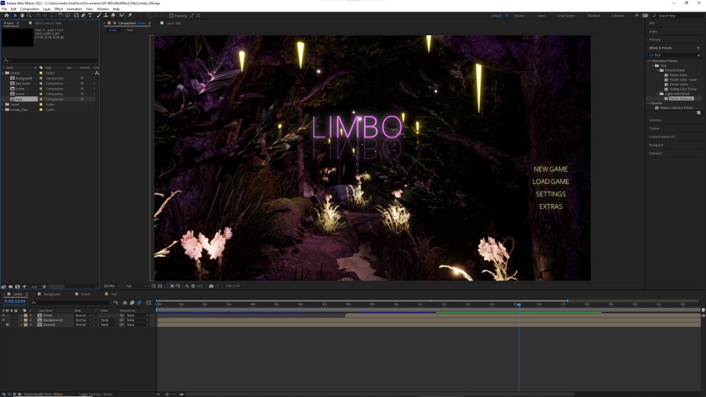 Finally, the text choice was designed to be sleek and simple, with a neon glow to look as though the text blends with the environment. I wanted to incorporate the flickering to create a dynamic loop while the slight reflection of the title is meant as an homage to the meaning of Limbo.